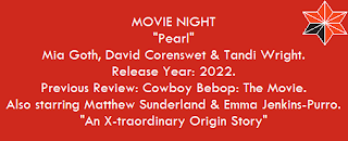 I'm sure you are familiar with X (2022). Well, if you are not, that is okay, because that was one of the films that slipped by my radar. It was a slasher film directed, written, co-produced, and co-edited by Ti West that apparently had homages to slasher films of the 1970s such as The Texas Chain Saw Massacre (1974), with Mia Goth as the star. After the production had wrapped, West started work on utilizing the script idea he and Goth had developed together, with the inspiration coming from his eagerness to direct movies during the onset of the coronavirus pandemic, with A24 being the production company for both ventures; had A24 not been interested in the idea as it was in terms of being made right after X (such as with budget), it would have been done in black-and-white, so one gets a movie with a color scheme meant to evoke Technicolor. Pearl takes inspiration from the works of Douglas Sirk while being shot as if was Mary Poppins meeting Texas Chain Saw Massacre. This is the ninth film from West, who started doing his own films in 2005, for which he has written all of them alongside serving as editor and producer on most of them.